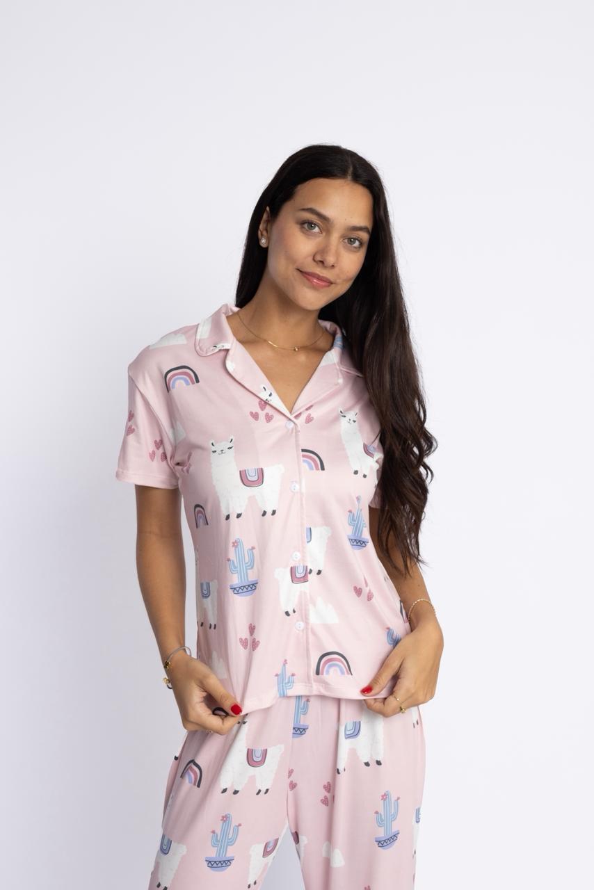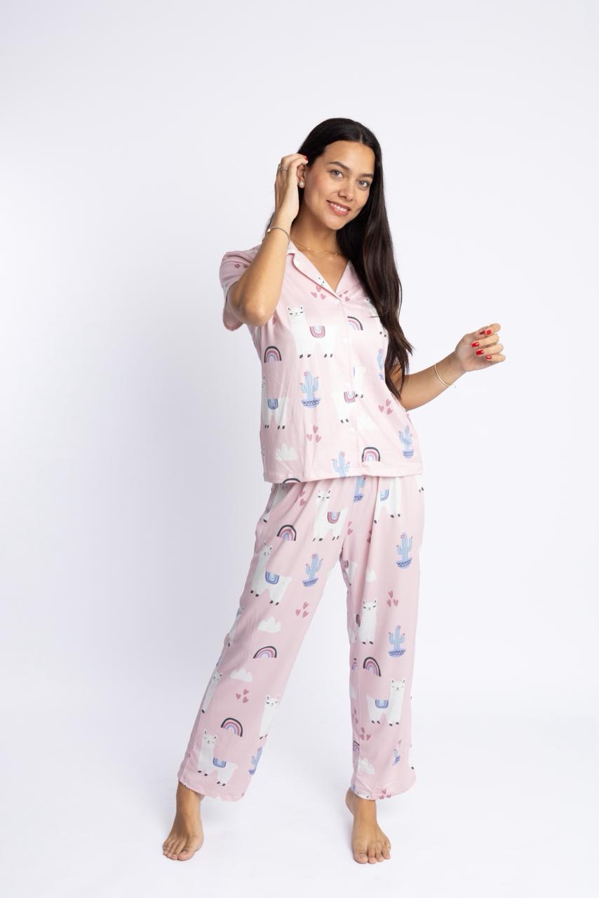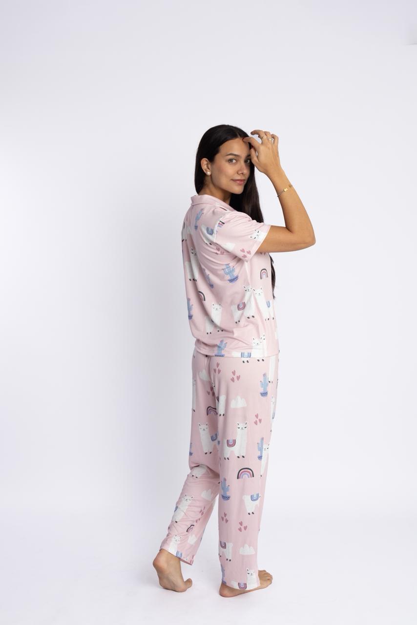 Pijama clásica Modelo Karito (Camisero & Pantalón suelto) con diseño exclusivo de llamitas rosadasNosotros diseñamos todas nuestras telas, no se encogen, no se destiñen, no se hacen bolitas y son suavecitas. Nuestras tallas son completas.